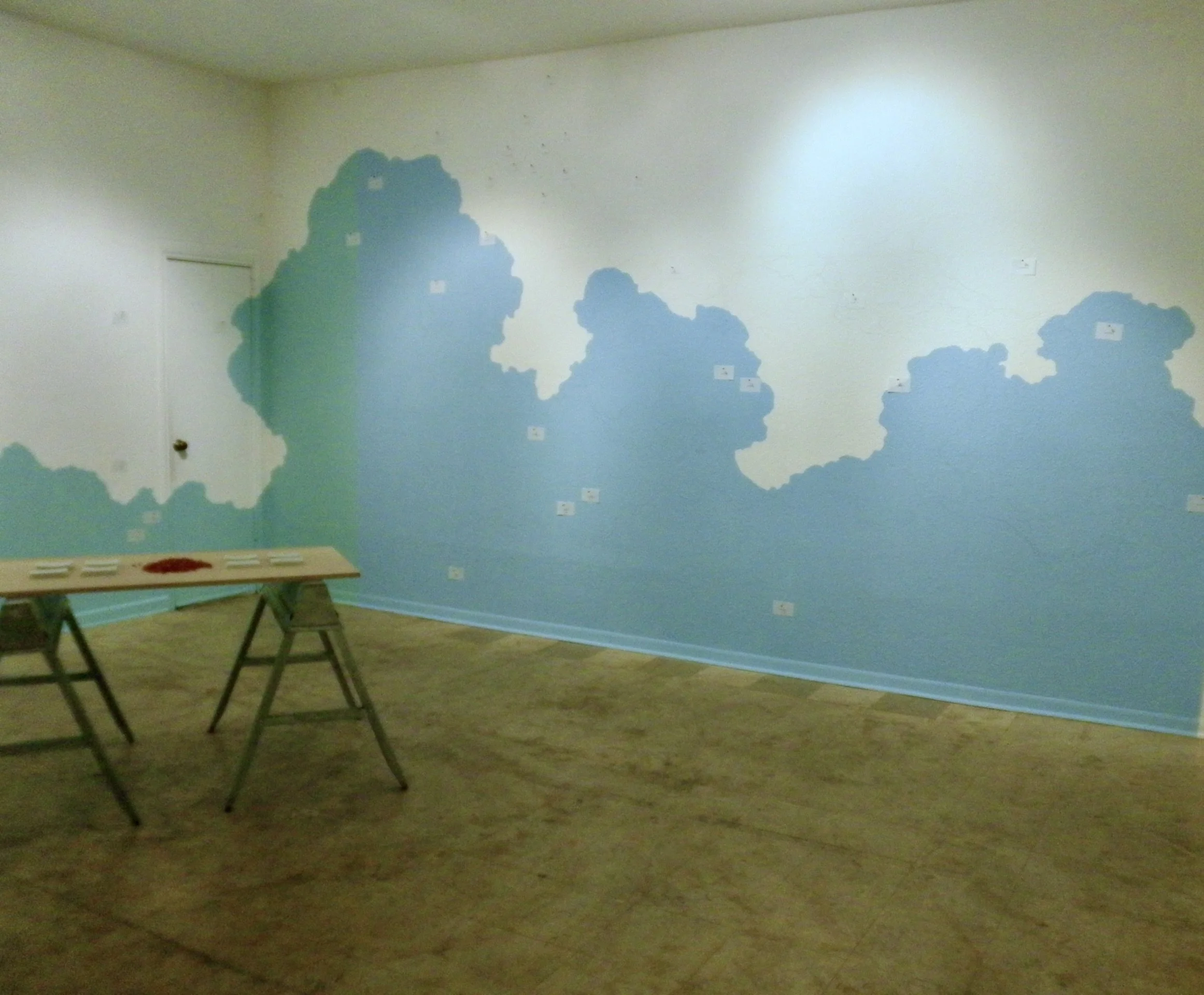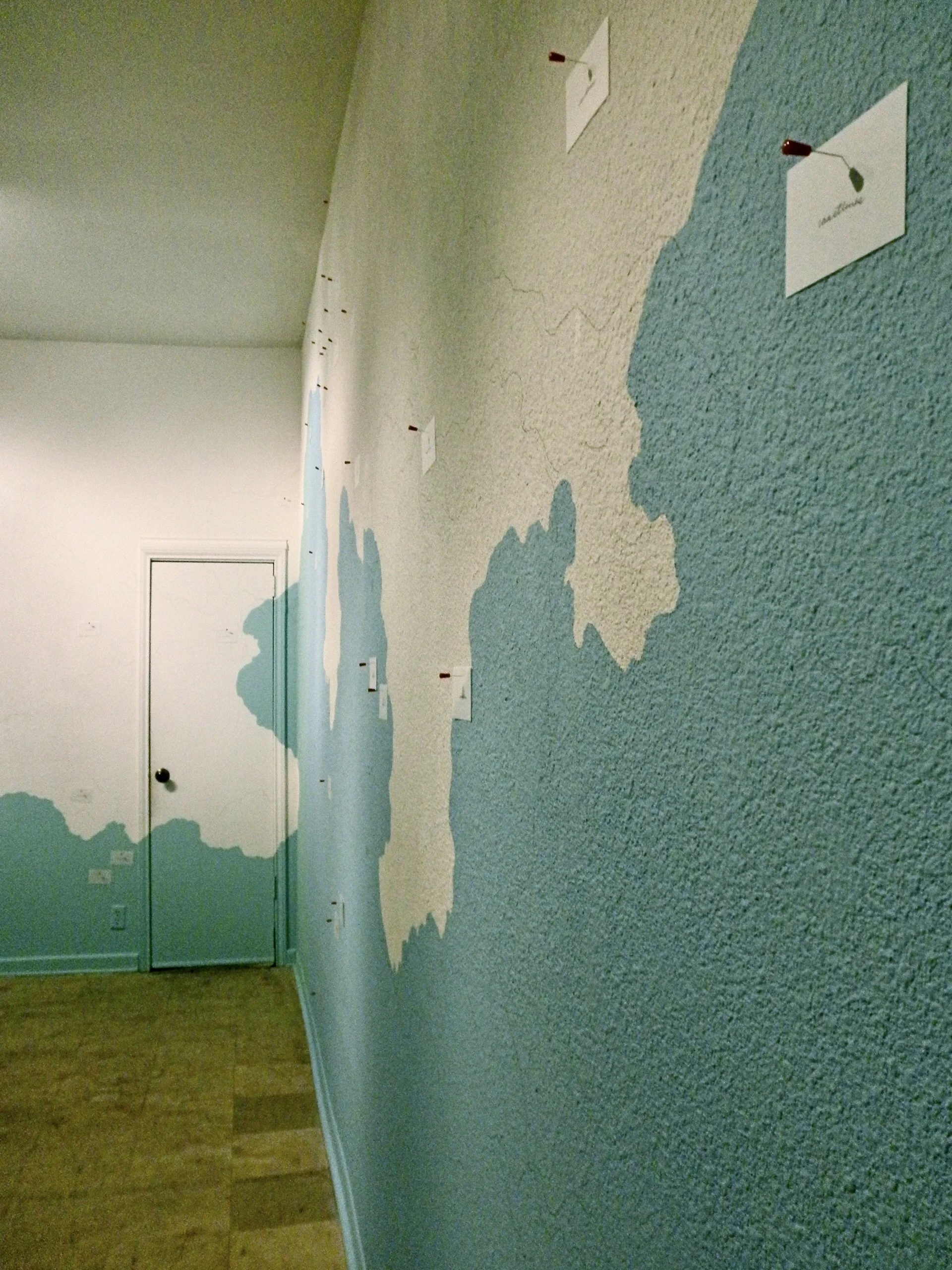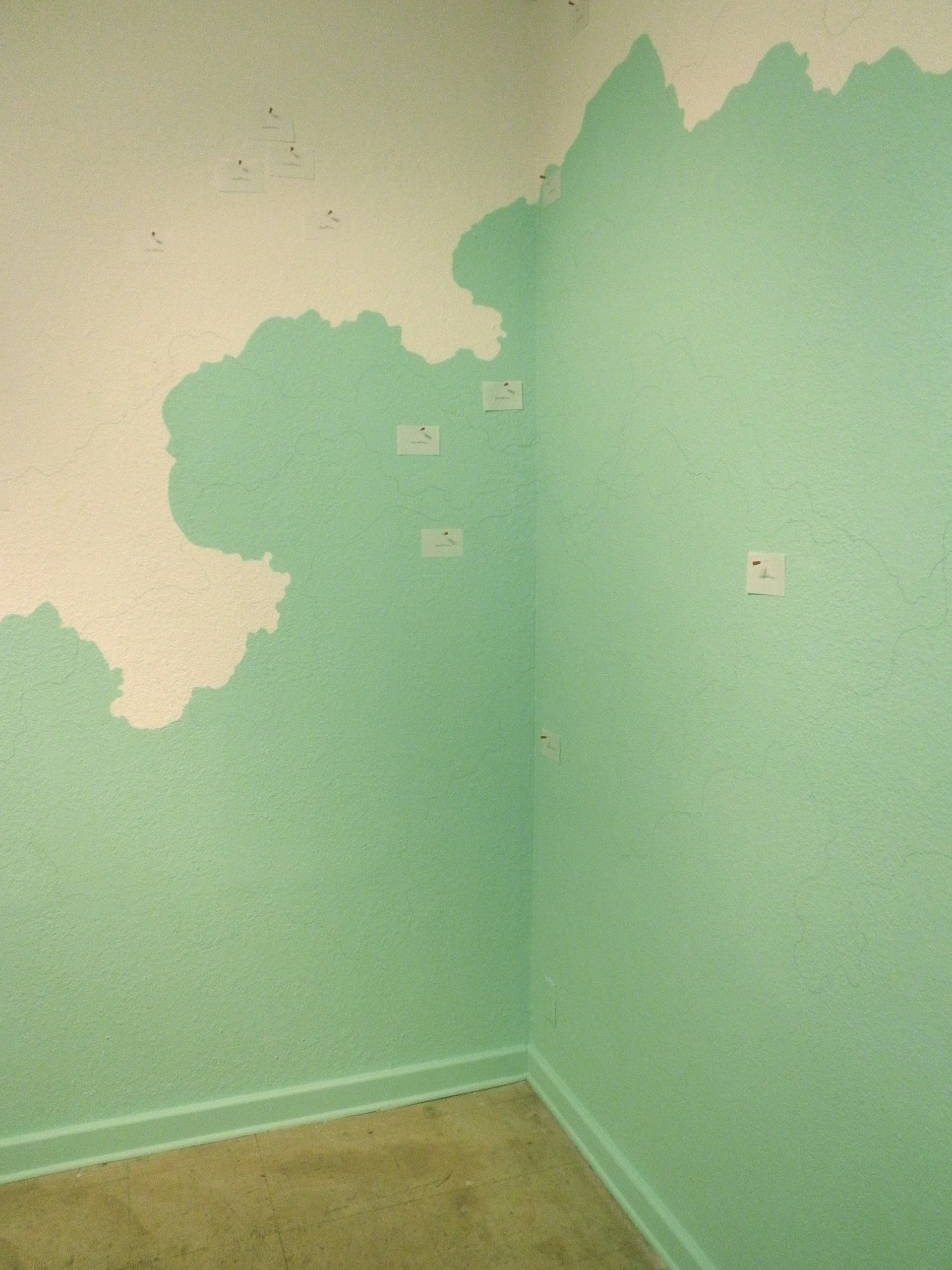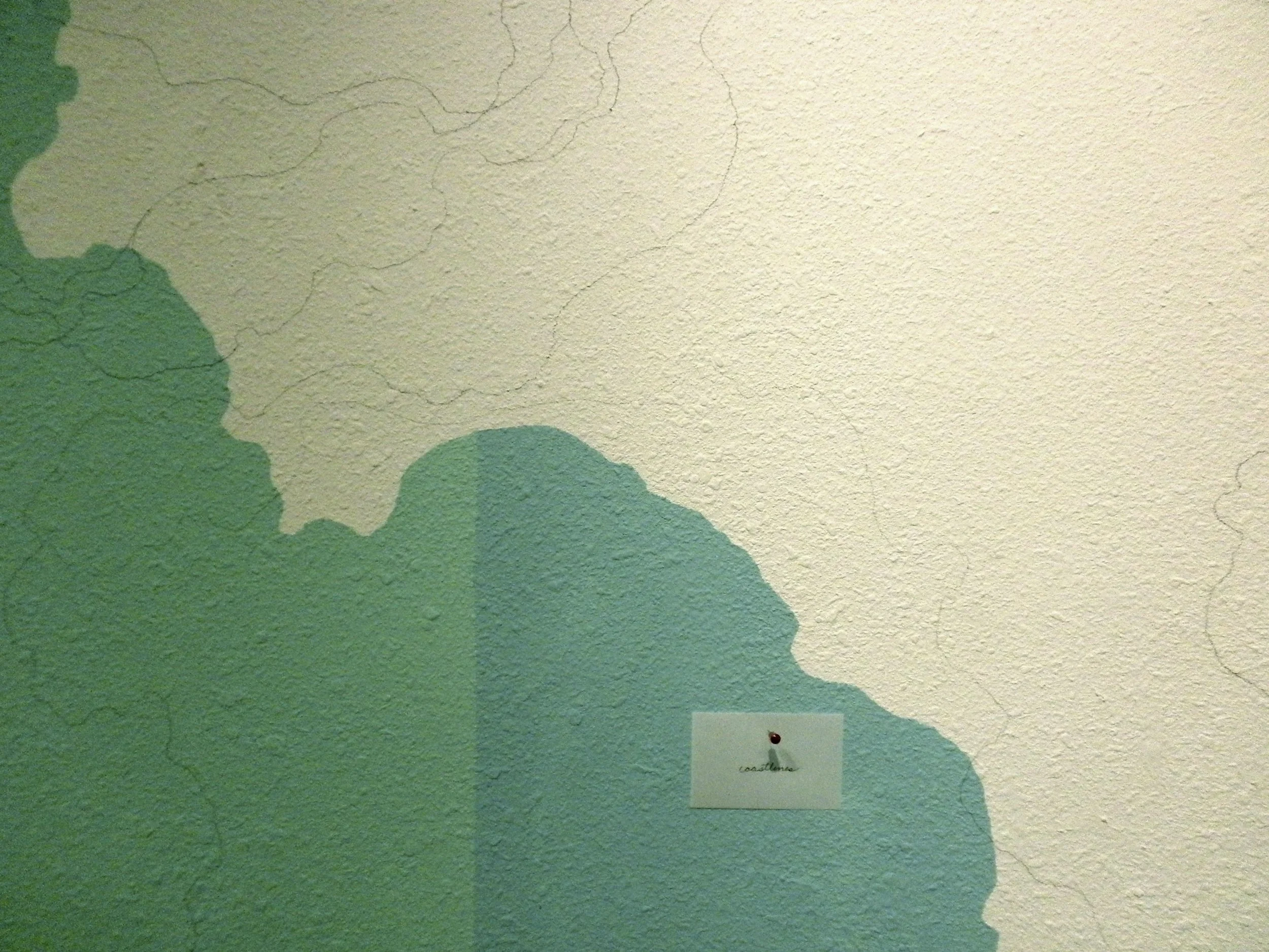 This site-specific installation transforms the gallery into a living map shaped by memory, movement, and collective decision-making. Blues and greens—recalled from worn, aging nautical charts—are painted directly onto the gallery walls, forming ambiguous contours that read simultaneously as coastlines and cloudlines. The painting resists a single interpretation, hovering between land and sky, stability and drift.