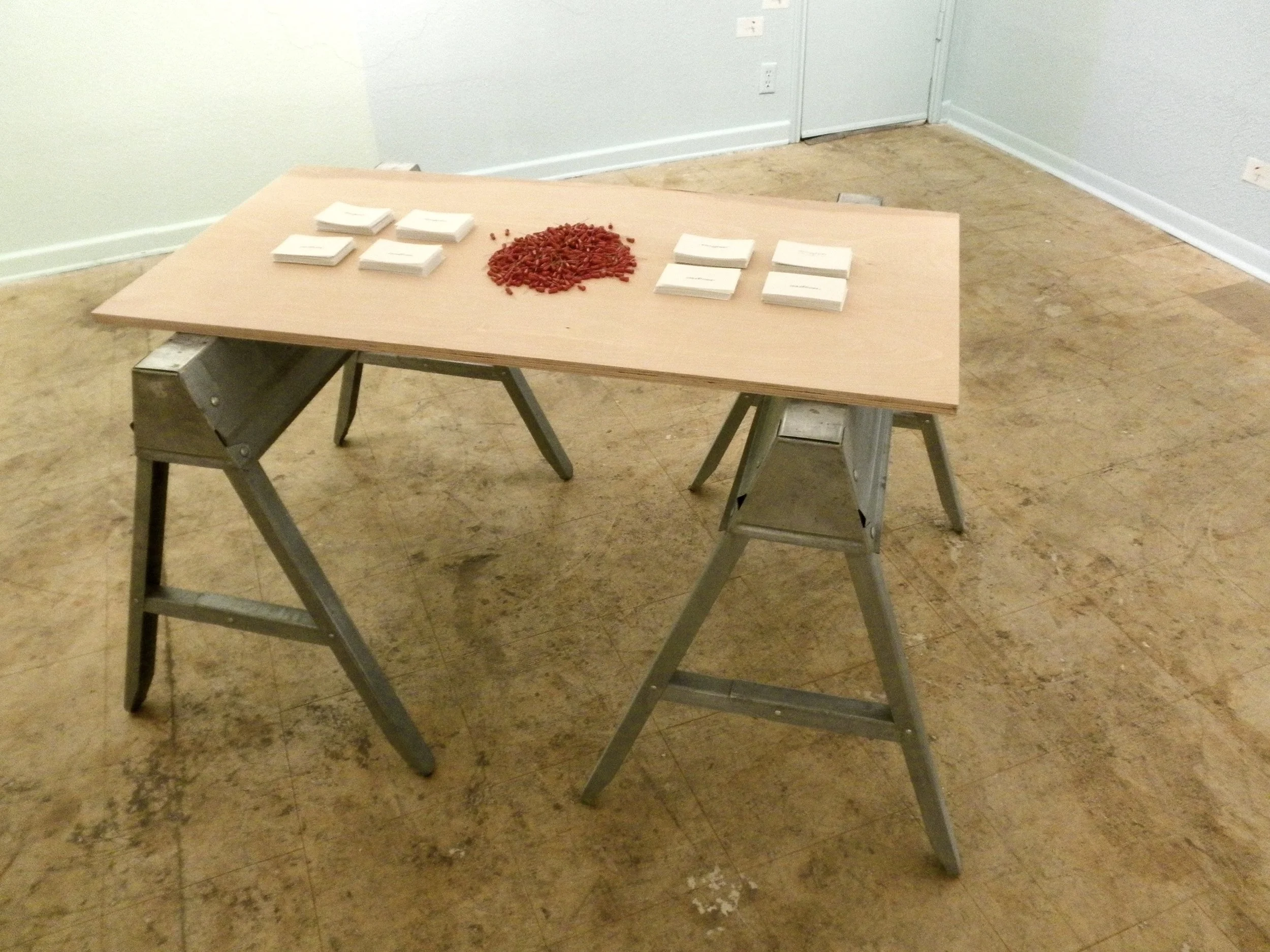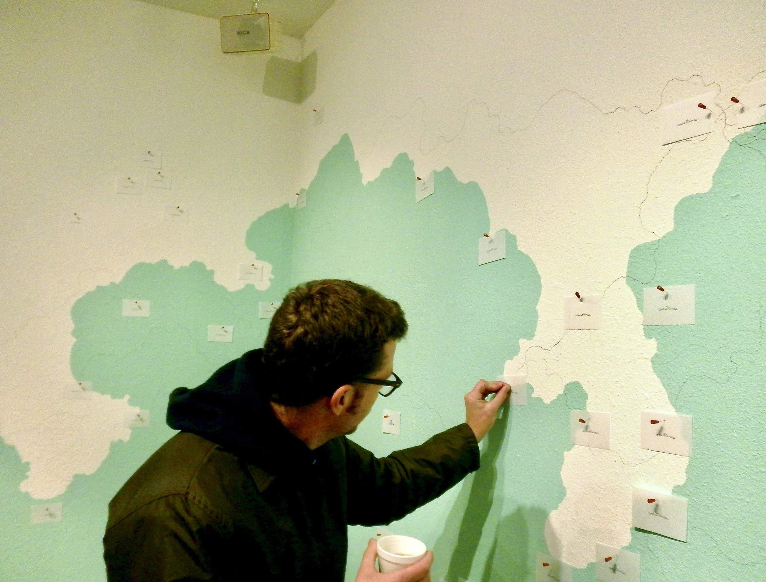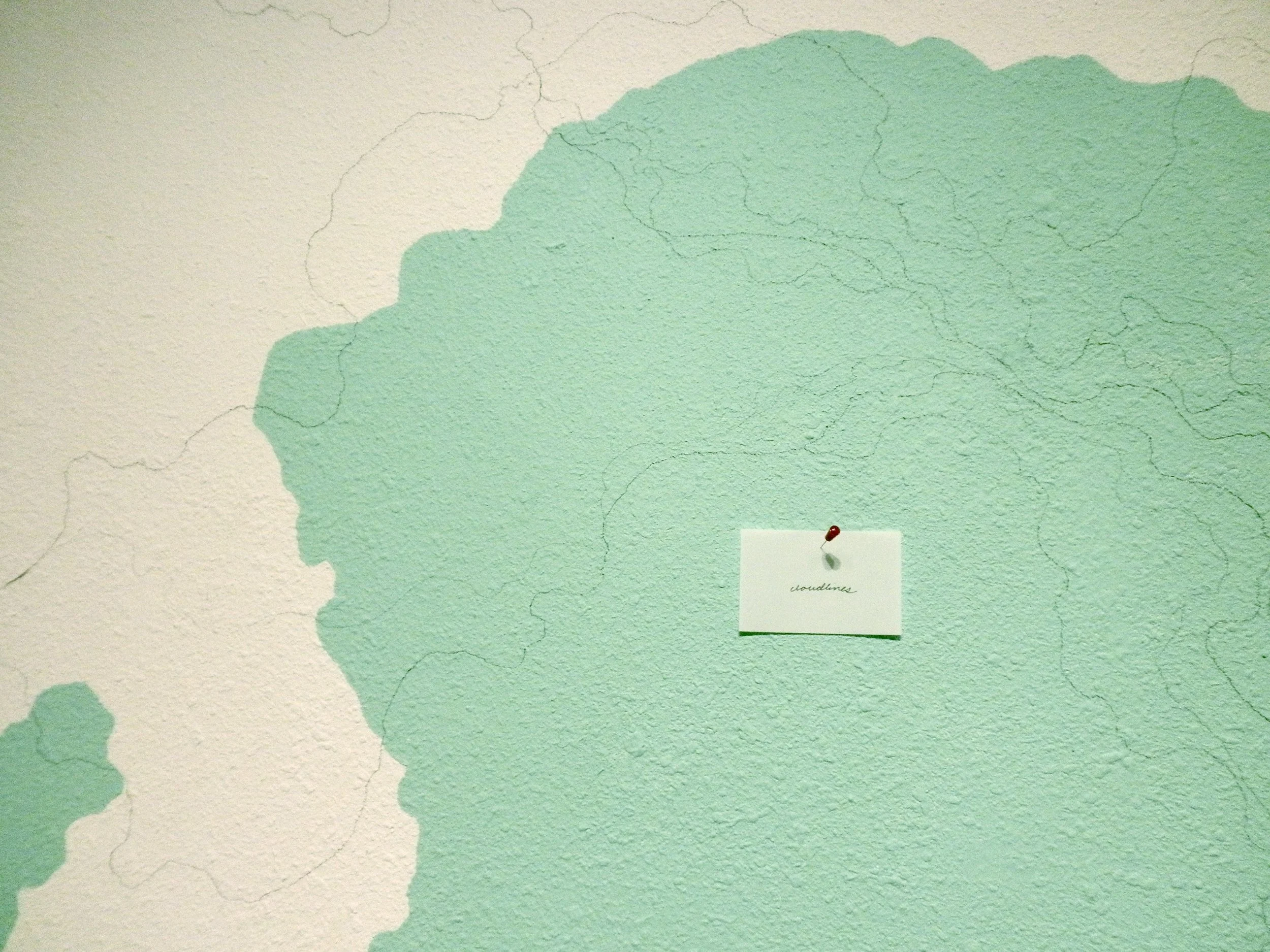 Upon entering the space, viewers encounter a table holding a pile of red map pins and two stacks of small, translucent labels. One set is handwritten with the word Coastlines; the other reads cloudlines. Visitors are invited to move through the installation, select a label, and place it on the wall using a red map pin, marking a point of personal interpretation. Each choice—coast or cloud, land or sky—becomes an act of mapping, guided by intuition rather than instruction.
