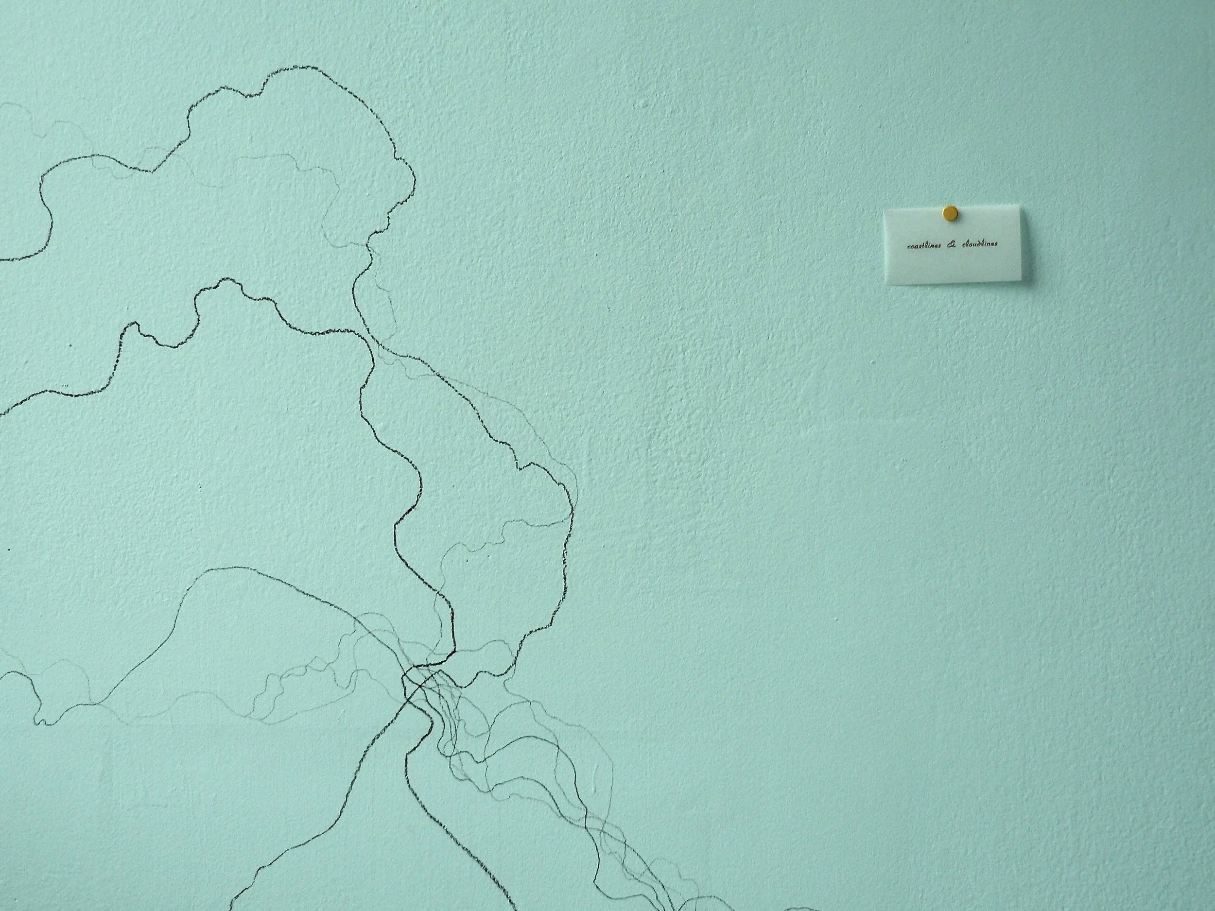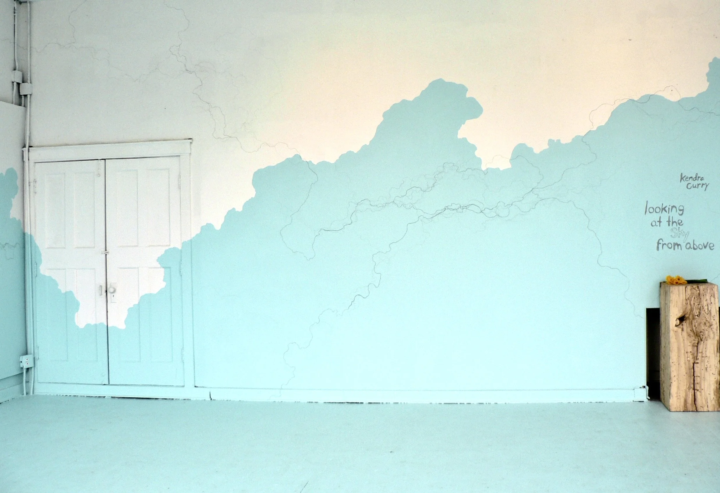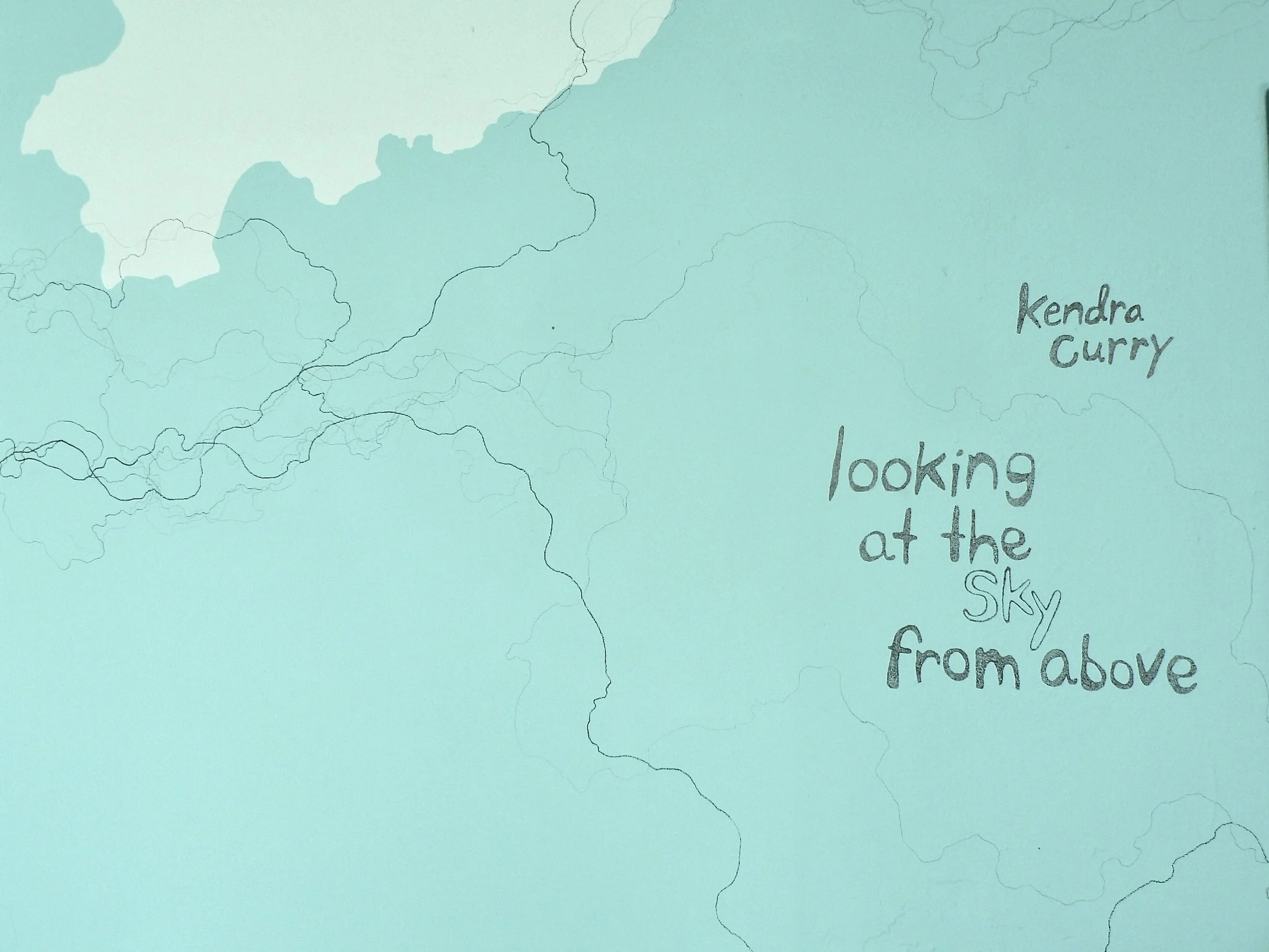 Looking at the Sky from Above is a site-specific installation that immerses the viewer in a mapped landscape where coast and sky converge and collapse into one another. A continuous coastline is painted in blue across the walls, ceiling, and floor of the gallery, transforming the architectural space into an enveloping field of contour and line. The blue references the color of NOAA nautical charts—maps the artist remembers from childhood, growing up near the ocean in a place where such charts were essential tools for navigating water and space.