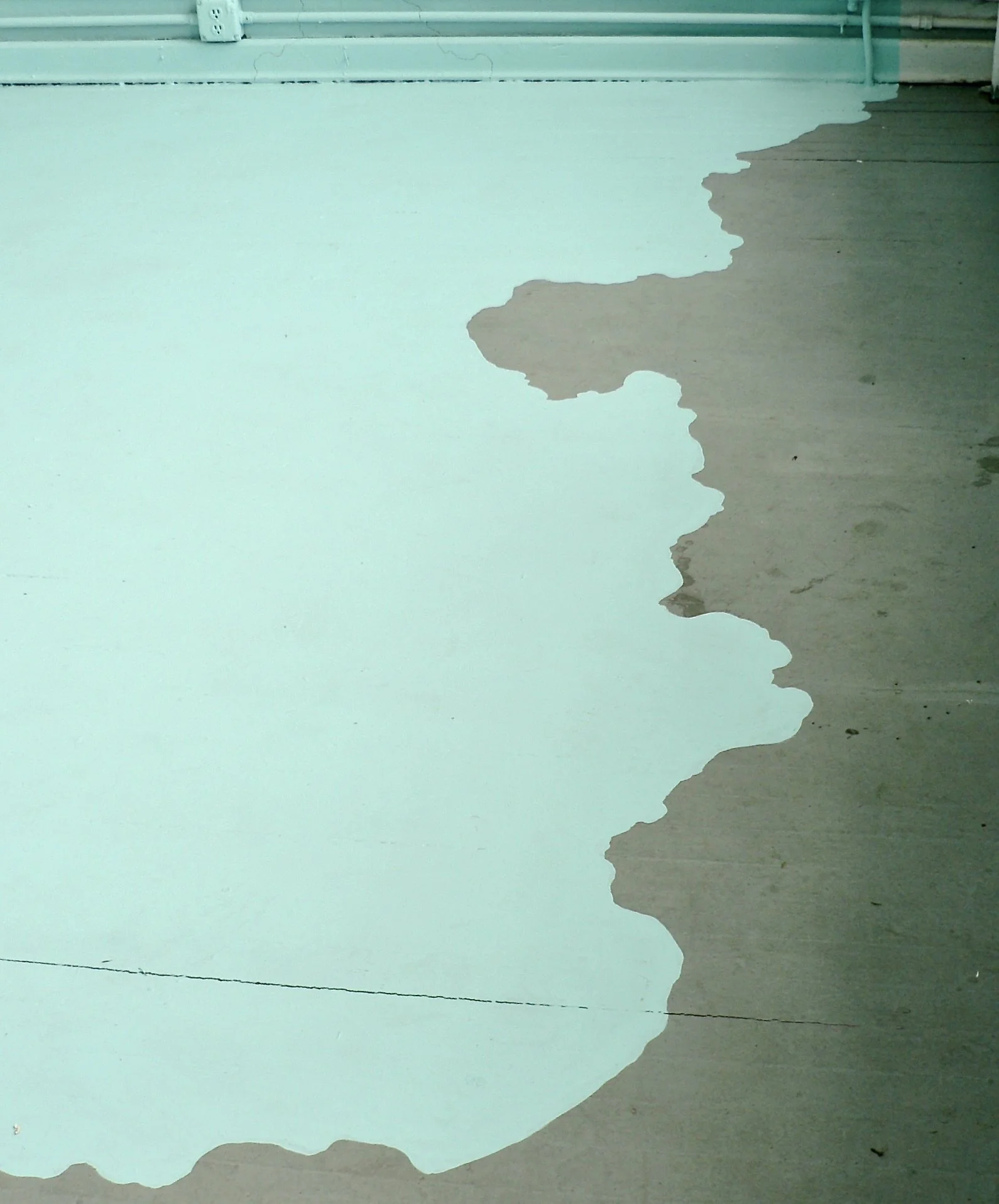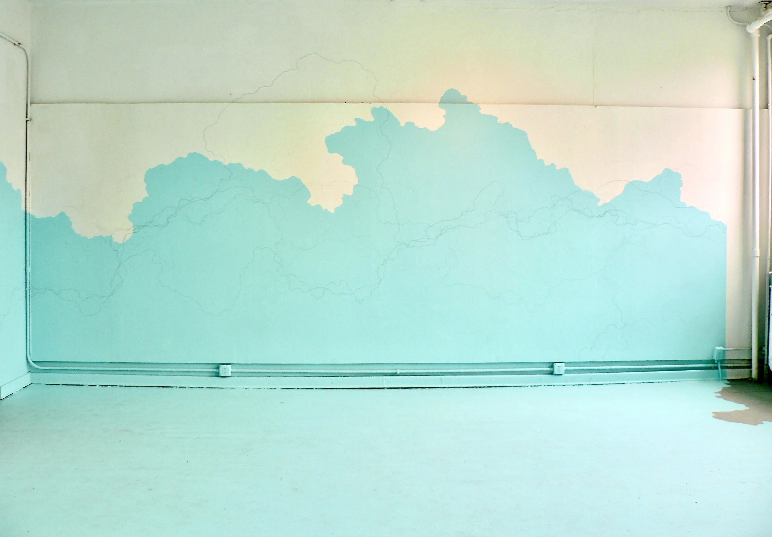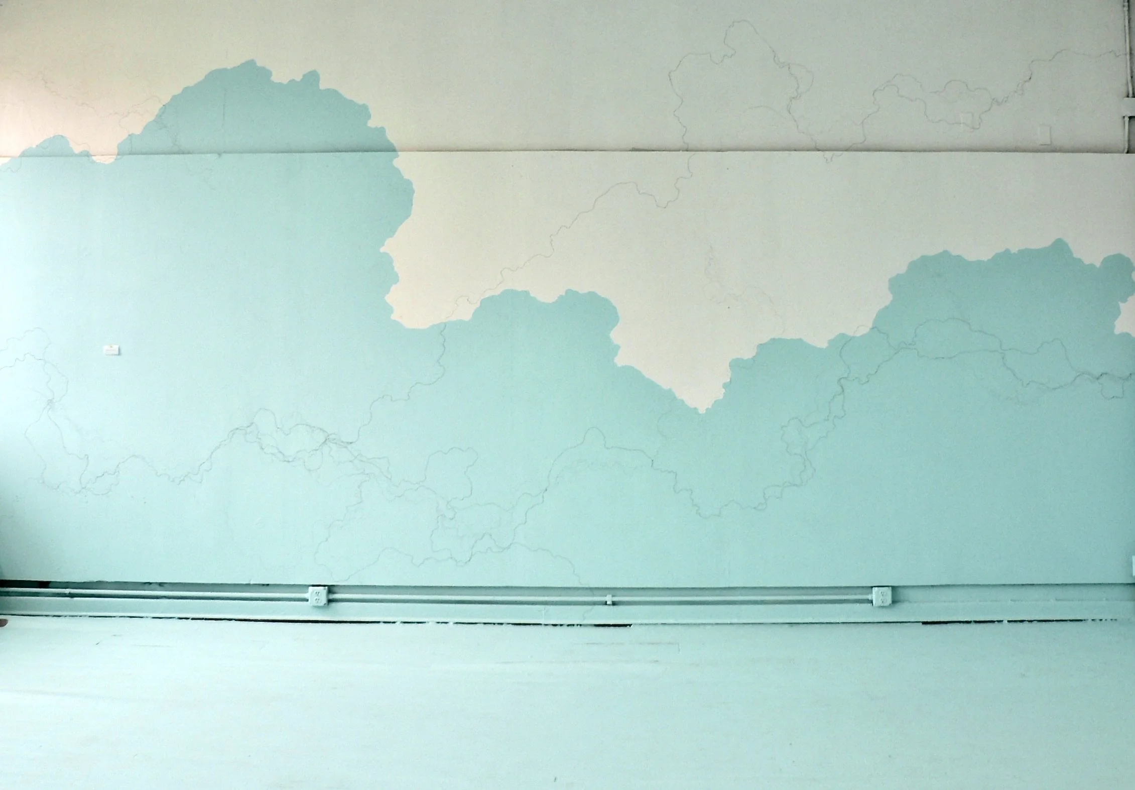Looking at the Sky from Above is a site-specific installation that immerses the viewer in a mapped landscape where coast and sky converge and collapse into one another. A continuous coastline is painted in blue across the walls, ceiling, and floor of the gallery, transforming the architectural space into an enveloping field of contour and line. The blue references the color of NOAA nautical charts—maps the artist remembers from childhood, growing up near the ocean in a place where such charts were essential tools for navigating water and space.